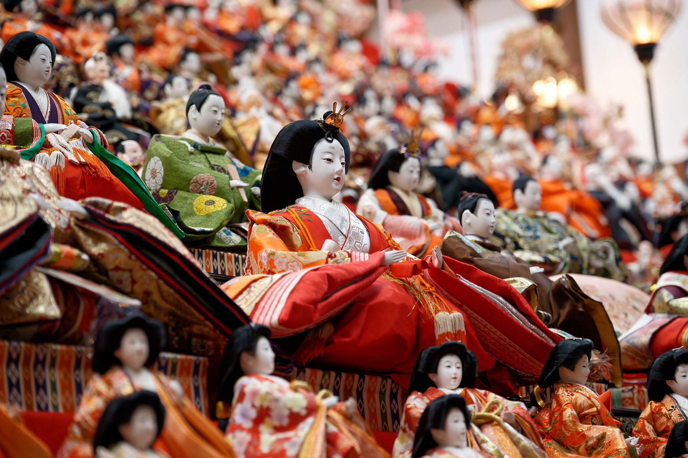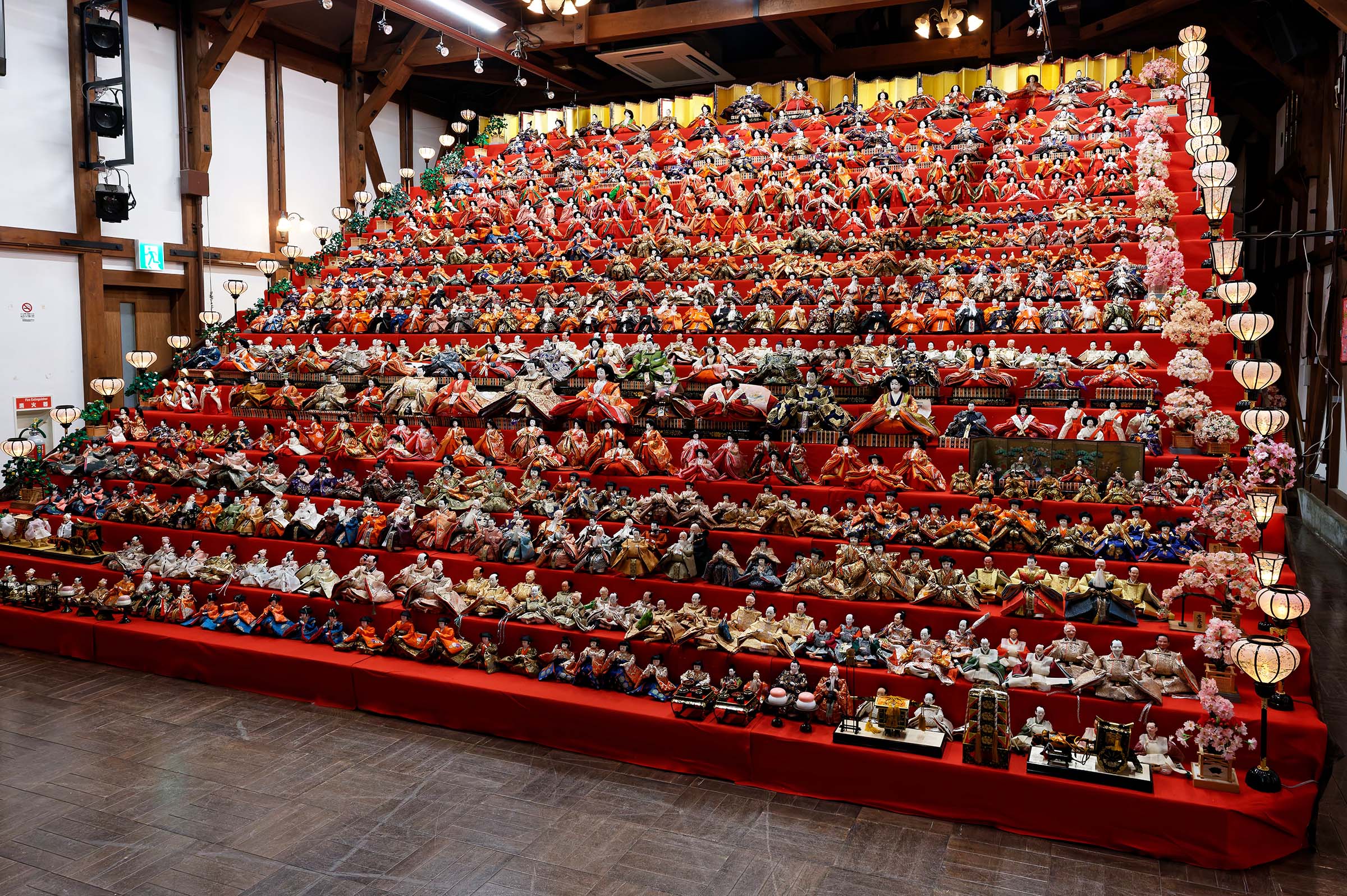 | 説明 | 大野の冬の風物詩となっている、越前おおの春を彩るひな祭りの時期に飾られる巨大ひな壇。20段のひな壇(高さ約4m、幅約7m)にはおよそ2千体のひな人形が飾られています。地元の有志が2011年から毎年展示をしています。 担当者の方がほぼ一人で3日間ほどかけて並べたそうです。複数人で飾り付けを行うと意見が合わずかえって時間がかかってしまうため、一人で行っているとのことでした。 足羽神社 |